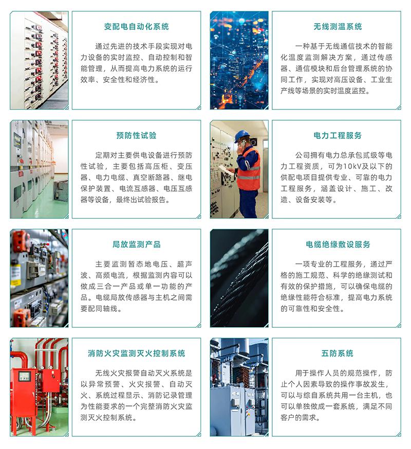 電力綜合服務(wù)聚焦電力系統(tǒng)全生命周期保障:以變配電自動化系統(tǒng)提升設(shè)備運維效能,通過無線測溫、局放監(jiān)測產(chǎn)品精準(zhǔn)掌握設(shè)備狀態(tài),輔以核心設(shè)備預(yù)防性試驗提前規(guī)避故障,同時提供電力全鏈條工程服務(wù),并配套電纜絕緣敷設(shè)、消防火監(jiān)監(jiān)測滅火控制系統(tǒng)、五防系統(tǒng)構(gòu)建全場景安全防護,全方位支撐電力系統(tǒng)安全、高效穩(wěn)定運行。