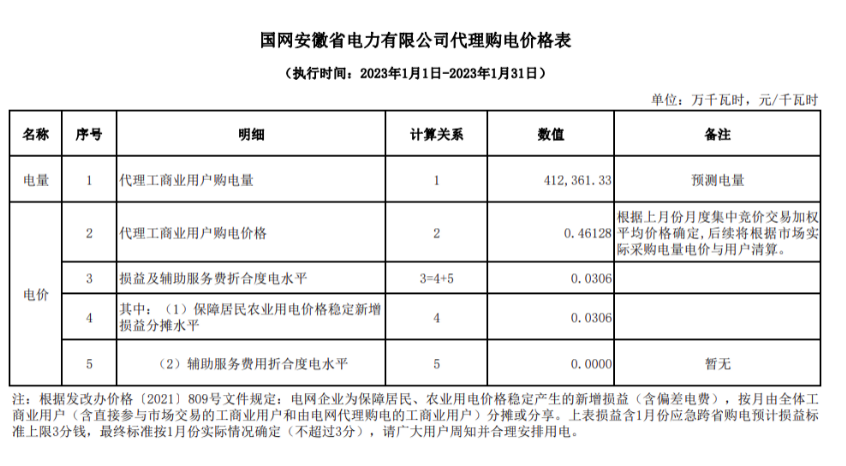 注:根據發(fā)改辦價格{2021}809號文件規(guī)定:電網企業(yè)為保障居民、農業(yè)用電價格穩(wěn)定產生的新增損益(含偏差電費),按月由全體工商業(yè)用戶(含直接參與市場交易的工商業(yè)用戶和由電網代理購電的工商業(yè)用戶)分攤或分享。上表損益含1月份應急跨省購電預計損益標準上限3分錢,最終標準按1月份實際情況確定(不超過3分),請廣大用戶周知并合理安排用電。