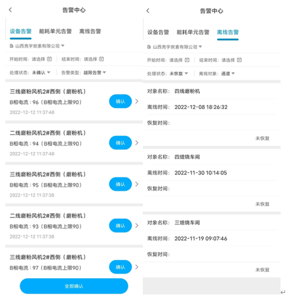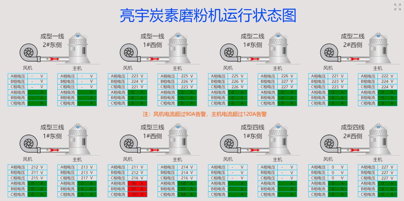 設(shè)備層面:建設(shè)對(duì)磨粉機(jī)設(shè)備的運(yùn)行狀態(tài)的監(jiān)測,通過對(duì)磨粉機(jī)電機(jī)的電壓電流監(jiān)測,判斷設(shè)備的運(yùn)行健康狀態(tài),做到電機(jī)電流的越限報(bào)警。